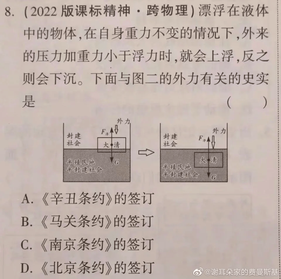 另外,近日中國微博亦出現一張2022版的歷史「跨物理」考試題目: