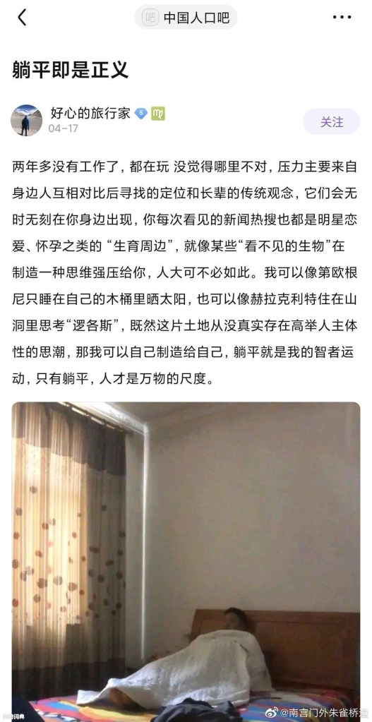 The concept of “lying-flatism” originated from a network article titled “Lying flat is justice” in a Baidu post, written by a user named “Good-hearted traveler”. However, “lying flat” does not emphasize not working and staying at home all the time. Instead, it proposes to earn only enough income to cover the minimum living expenses, and suggests “not buying a house, not buying a car, not getting married, not having children, not consuming, maintaining the minimum standard of living, and refusing to become a money-making machine or an exploited slave for others.”